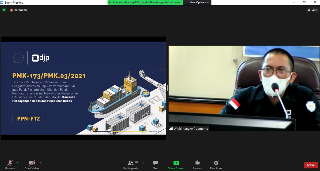 Materi PMK-173/PMK.03/2021 tentang Tata Cara Pembayaran, Pelunasan, dan Pengadministrasian Pajak Pertambahan Nilai atau Pajak Pertambahan Nilai dan Pajak Penjualan atas Barang Mewah atas Penyerahan BKP dan/atau JKP dari dan/atau ke Kawasan Perdagangan Bebas dan Pelabuhan Bebas yang berlaku mulai 2 Februari 2022 disampaikan oleh tim penyuluh KPP Pratama Bandung Cicadas, Widhi Kangko Pernomo dan Siska Maharani.