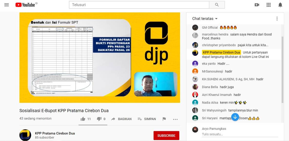 KPP Pratama Cirebon Dua menyelenggarakan sosialisasi perpajakan melalui media Live Youtube di Cirebon (Rabu, 5/8). Sosialisasi dengan tema “Implementasi Nasional e-Bupot PPh 23/26 untuk seluruh PKP” ini diikuti oleh Pengusaha Kena Pajak (PKP) yang terdaftar dalam wilayah kerja KPP Pratama Cirebon Dua. Materi Sosialisasi e-Bupot PPh 23/26 kali ini disampaikan oleh salah satu Account Representative KPP Pratama Cirebon Dua Suryama.