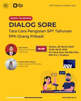 Tim penyuluh Kantor Pelayanan Pajak (KPP) Pratama Cirebon Satu Sugi Utomo dan Dwisthi Ridha Amalia mengisi radio talkshow di RRI Pro1 Cirebon dengan membahas tema “Tata Cara Pengisian SPT Tahunan Orang Pribadi” (Selasa, 29/3).