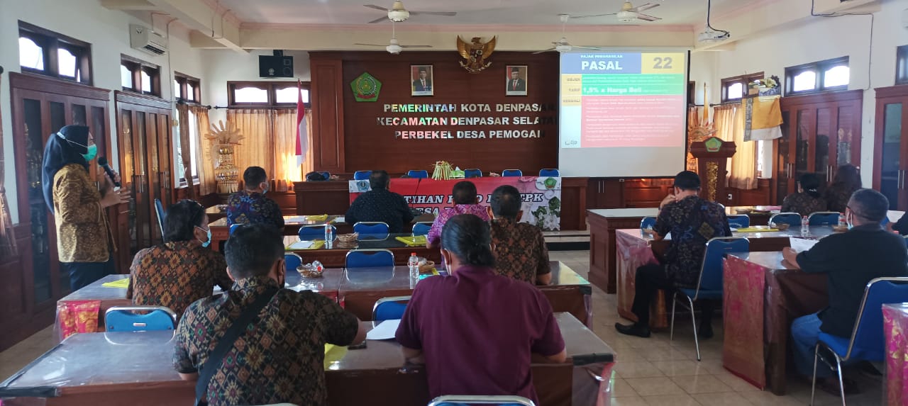Memenuhi undangan dari perangkat desa Pemogan Denpasar mengenai pembekalan pengetahuan perpajakan bagi perangkat desa dan pengurus Badan Usaha Milik Desa (BUMDes), Kantor Pelayanan Pajak (KPP) Pratama Denpasar Timur menugaskan asisten penyuluh pajak untuk memberikan edukasi perpajakan. Kegiatan dihadiri oleh sejumlah perangkat desa, pengurus BUMDes, dan beberapa tokoh masyarakat. Kegiatan berlangsung di ruang pertemuan Desa Pemogan, Denpasar (Selasa, 31/5).