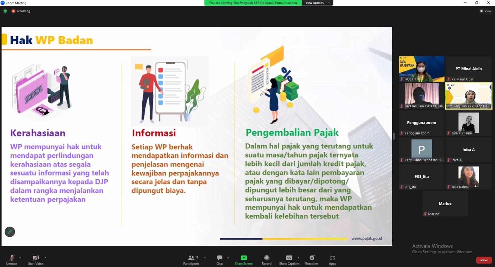Kantor Pelayanan Pajak (KPP) Pratama Denpasar Timur (Dentim) menyelenggarakan kegiatan edukasi perpajakan dengan tema Sapa Wajib Pajak (WP) baru secara daring melalui Zoom Meeting di Denpasar (Selasa, 4/4). Kegiatan ini rutin diadakan setiap dua minggu dengan tujuan untuk memperkenalkan kewajiban perpajakan kepada WP yang baru mendaftar memiliki Nomor Pokok Wajib Pajak.