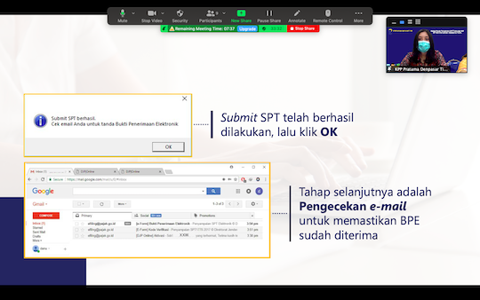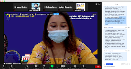 Tim Penyuluh Perpajakan KPP Pratama Denpasar Timur kembali mengadakan Kelas Pajak Pengisian SPT Tahunan secara daring melalui Zoom Meeting dari Denpasar (Kamis, 11/2). Pada hari yang sama pukul 10.00 WITA, telah diadakan Kelas Pajak serupa dengan sasaran kegiatan adalah Wajib Pajak Orang Pribadi Karyawan, sedangkan pada pukul 15.00 WITA, sasaran kegiatan adalah Wajib Pajak Orang Pribadi Non Karyawan, khususnya UMKM, sehingga materi yang dipaparkan dikhususkan membahas e-Form.