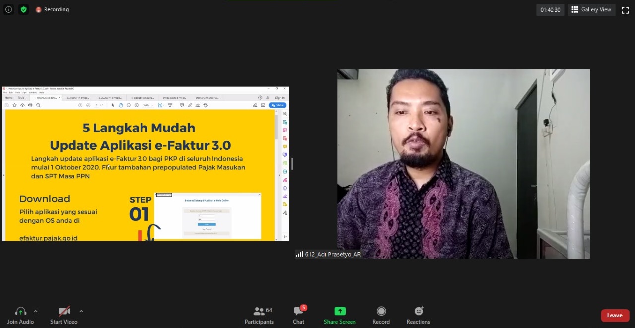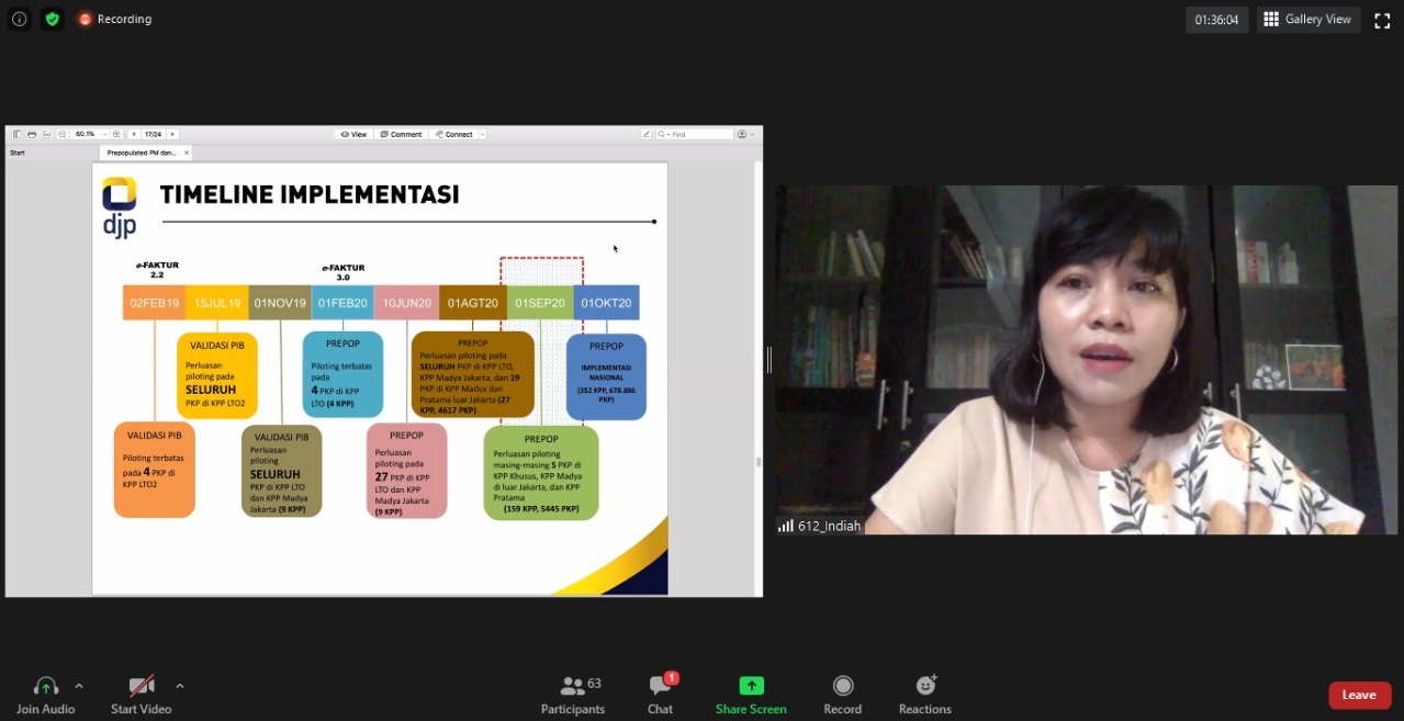 Kantor Pelayanan Pajak (KPP) Pratama Gresik Utara menyelenggarakan kelas pajak dengan tema Sosialisasi Implementasi Prepopulated Pajak Masukan dan SPT Masa PPN pada Aplikasi e-Faktur di Gresik (Kamis, 24/9). Sebanyak 57 peserta yang merupakan Pengusaha Kena Pajak (PKP) mengikuti kelas pajak yang dilaksanakan secara daring tersebut.