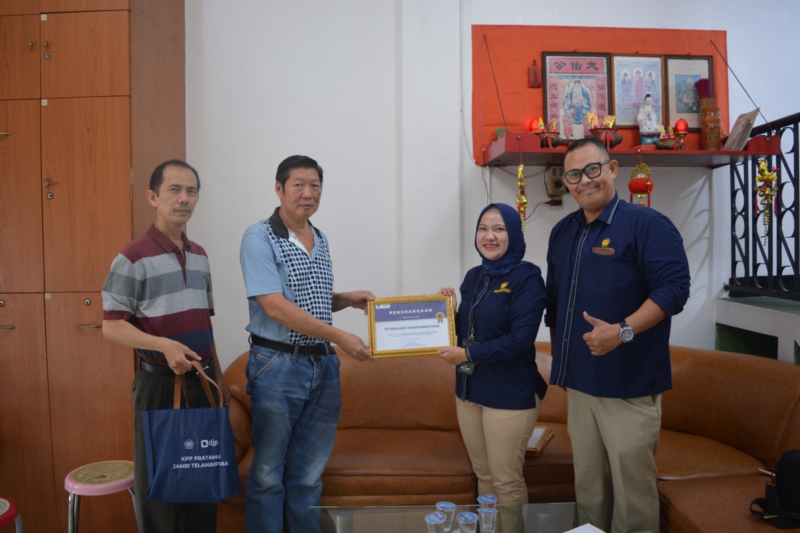 Kantor Pelayanan Pajak (KPP) Pratama Jambi Telanaipura melakukan kunjungan kerja ke PT Kurnia Tunggal Nugraha dan PT Erasakti Wiraforestama yang berlokasi di Jl. WR Supratman, Orang Kayo Hitam, Pasar Jambi, Kota Jambi (Rabu, 10/7). Kunjungan ini dilakukan untuk memberikan penghargaan kepada sejumlah wajib pajak dengan pembayaran pajak terbesar pada Tahun Pajak 2023 di wilayah kerja KPP Pratama Jambi Telanaipura.