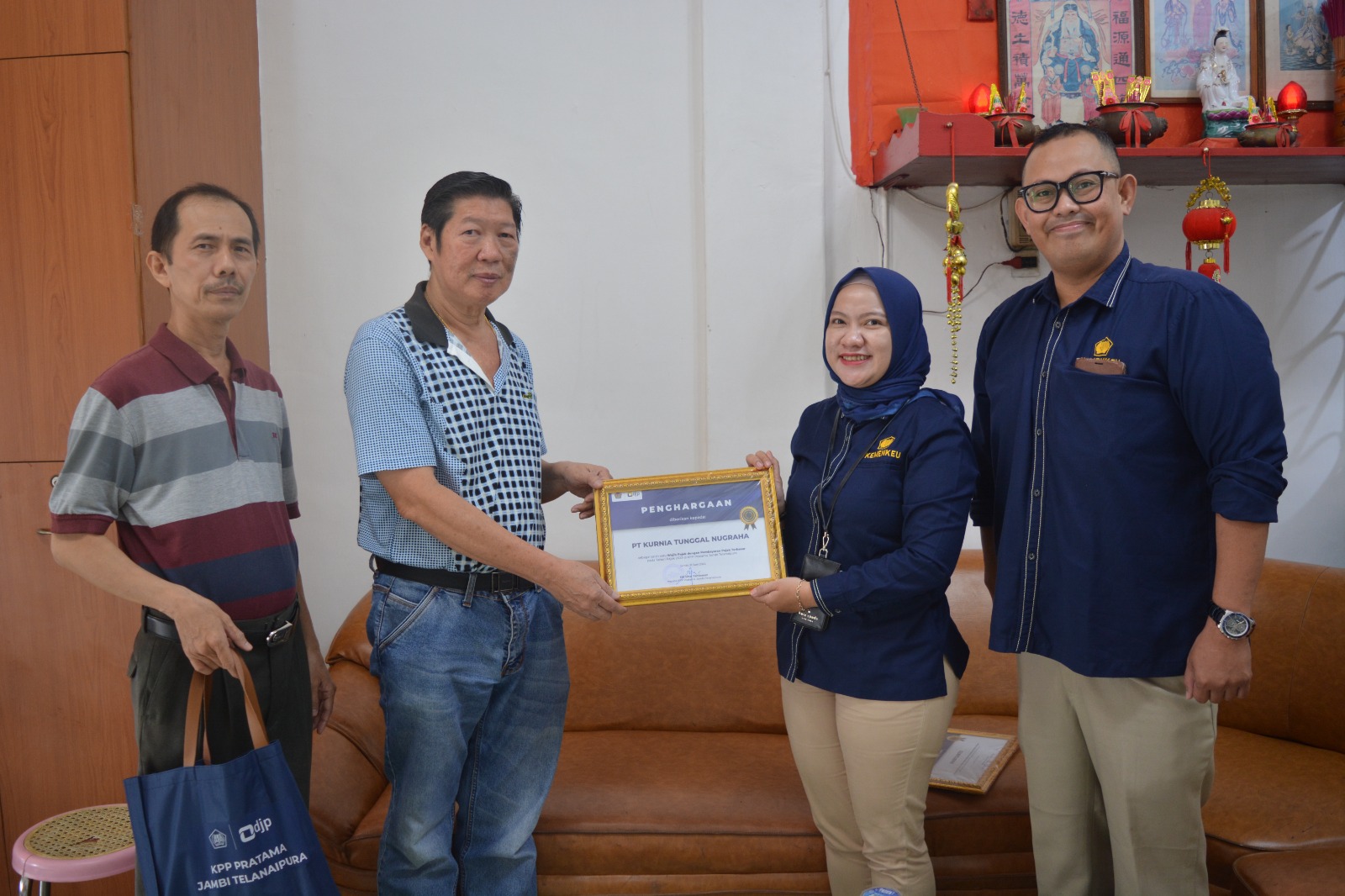 "Kami mengucapkan terima kasih atas kontribusi PT Kurnia Tunggal Nugraha dan PT Erasakti Wiraforestama. Ini adalah penghargaan dari KPP Pratama Jambi Telanaipura atas dedikasi dan kepatuhan dalam memenuhi kewajiban perpajakan," ujar Irma Miranti.
