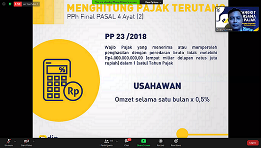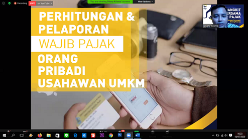 Webinar ini merupakan pelatihan bagi masyarakat khususnya pegiat UMKM dalam rangka penyusunan, perhitungan, dan pelaporan pajak UMKM. Dalam kegiatan ini peserta dijelaskan mengenai hak dan kewajiban wajib pajak sektor UMKM. Selain itu, peserta juga diberikan penjelasan mengenai kebijakan Direktorat Jenderal Pajak dalam merespons pandemi Covid-19, seperti pemberian insentif pajak dan kebijakan prosedur pelayanan perpajakan yang diberikan kepada wajib pajak dalam kenormalan baru.