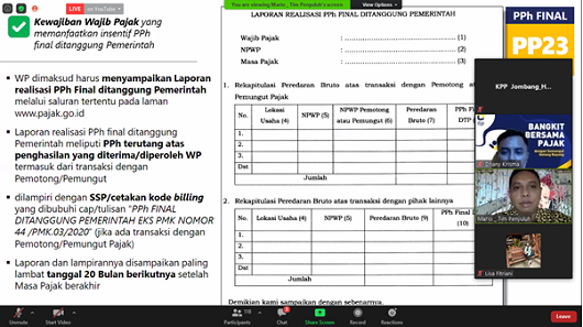 Kantor Pelayanan Pajak (KPP) Pratama Jombang bekerja sama dengan Tax Center Dewantara dan Universitas Binaniaga Indonesia mengadakan Webinar Nasional dengan tema "Mekanisme Penyusunan, Perhitungan, dan Pelaporan Pajak UMKM" di Jombang (Sabtu, 18/7). Dua pegawai KPP Pratama Jombang menjadi pemateri dalam webinar ini. Kegiatan ini diikuti oleh kalangan mahasiswa dan pegiat UMKM.