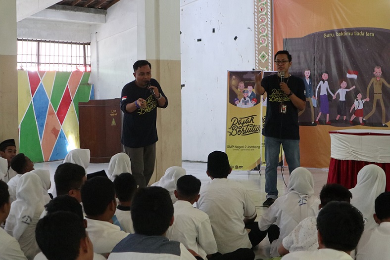Kantor Pelayanan Pajak (KPP) Pratama Jombang menyelenggarakan kegiatan Pajak Bertutur di Sekolah Menengah Pertama (SMP) Negeri 2 Jombang (Jumat, 22/11). Pajak Bertutur merupakan program kegiatan mengajar yang dicetuskan oleh Direktorat Jenderal Pajak (DJP) dengan visi mewujudkan generasi bangsa berkarakter cinta tanah air serta menjadikan kesadaran pajak sebagai salah satu budaya bangsa untuk terus ditanamkan dari generasi ke generasi.