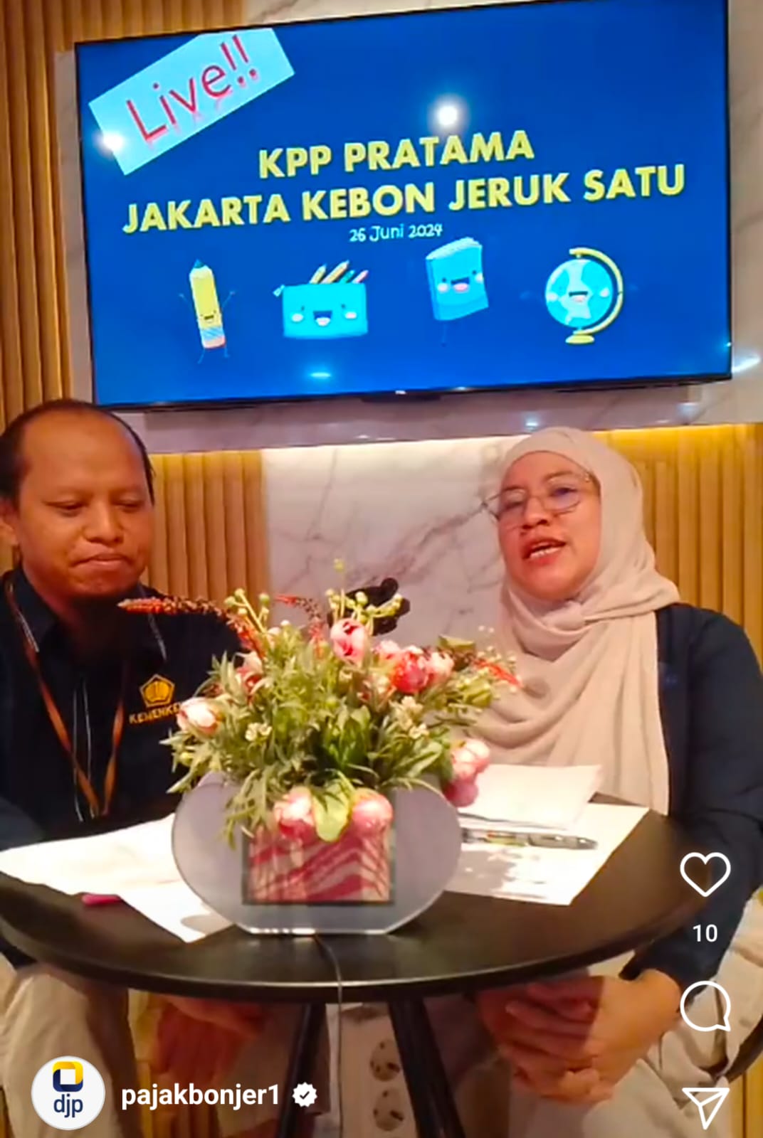 Live Instagram ini berlansung dari pukul 14.00 hingga pukul 15.00 WIB. Narasumber pada live Instagram kali ini adalah Fungsional Penyuluh Pajak dari KPP Pratama Jakarta Kebon Jeruk Satu Sutarmo dan Ana Farida Sahara.