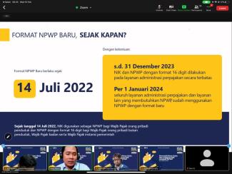 Kantor Pelayanan Pajak (KPP) Pratama Jakarta Kembangan kembali menyelenggarakan Kelas Pajak secara daring (Rabu, 15/2). Dalam kegiatan yang digelar selama dua hari, mulai tanggal 14 s.d 15 Februari 2023, Tim Fungsional Penyuluh Pajak KPP Pratama Jakarta Kembangan memberikan edukasi dengan tema Pemutakhiran Data dan Integrasi NIK menjadi NPWP.