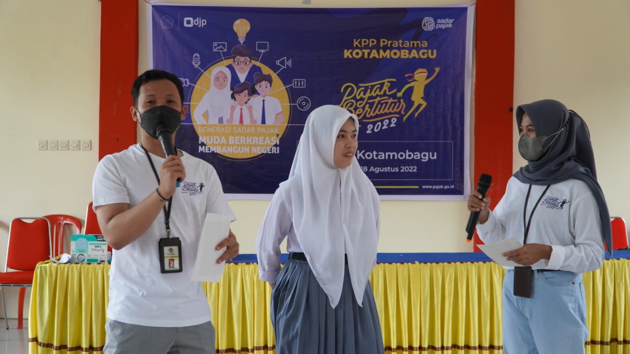 “Pada hari ini diselenggarakan Pajak Bertutur serentak se-Indonesia, dari Aceh sampai Papua. Tujuannya apa? Yakni untuk mengenalkan kepada Adik-adik semua tentang pajak. Dalam postur APBN negara kita saat ini hampir delapan puluh persen dari pajak. Jadi saat ini, denyut nadi negara kita untuk pembangunan infrastruktur, jalan, sekolah, vaksin, dan gaji Bapak-Ibu di sini itu dari pajak.” jelas Kepala KPP Pratama Kotamobagu Andhik Tri Indratama tentang urgensi pajak.