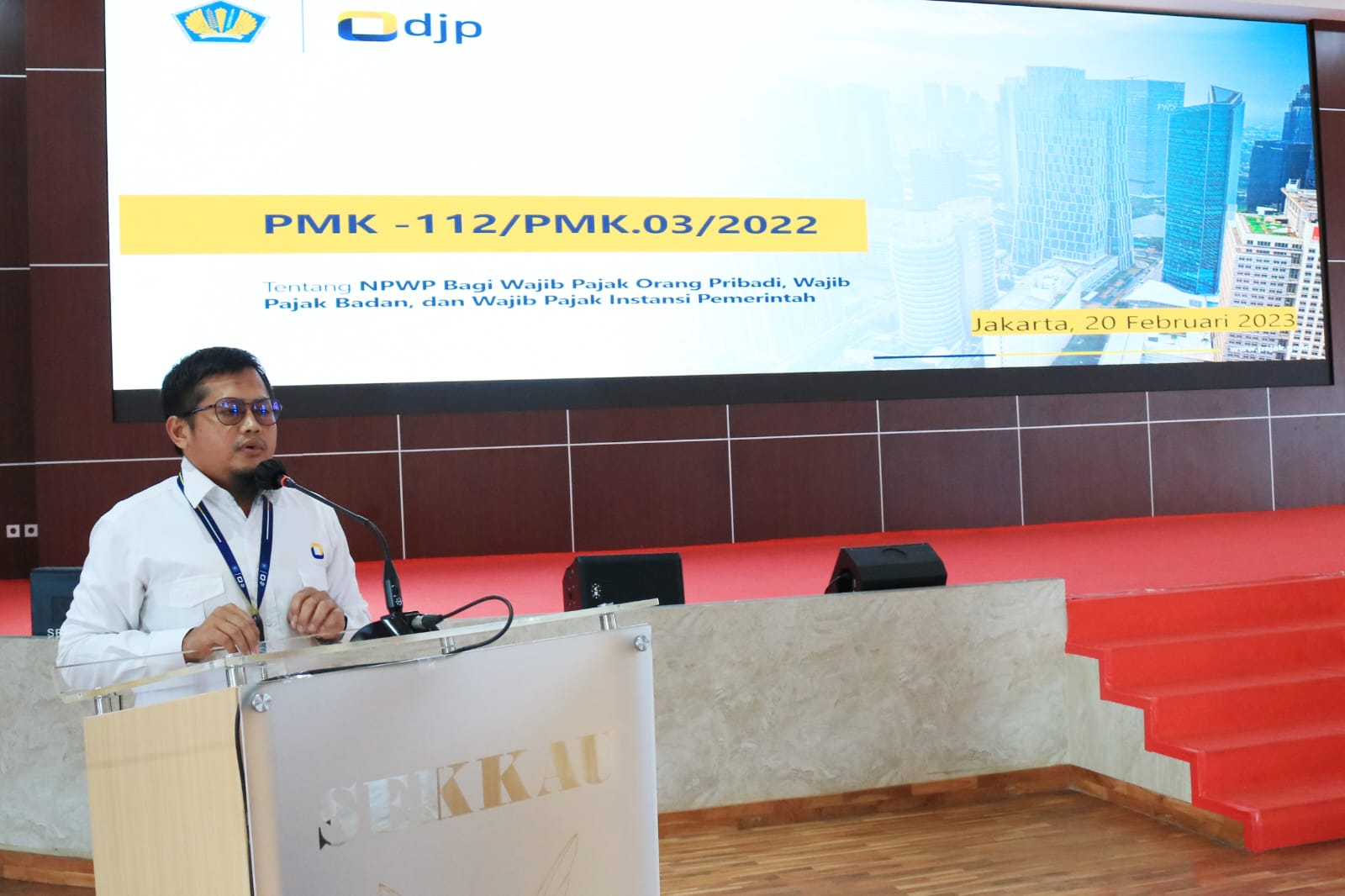 Kepala Dinas Operasi Pendidikan Sekkau Wahyu Bintoro memberikan sambutan serta ucapan terima kasih kepada tim penyuluh pajak KPP Pratama Jakarta Kramat Jati yang telah memberikan edukasi untuk meningkatkan pemahaman para pegawai mengenai peran penting Nomor Induk Kependudukan (NIK) dalam administrasi perpajakan serta tata cara pelaporan SPT Tahunan bagi Wajib Pajak Orang Pribadi.