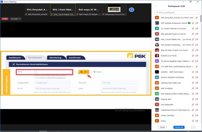 Kantor Pelayanan Pajak (KPP) Madya Denpasar kembali menggelar kegiatan sosialisasi perpajakan kepada Wajib Pajak (WP) sebagai salah satu upaya mengingatkan mengenai berbagai peraturan perpajakan terbaru. Salah satu materi yang dibahas dalam sosialisasi tersebut adalah peraturan terkait mekanisme pemindahbukuan menggunakan e-PBK. Kegiatan sosialisasi PPN diadakan secara daring dan dihadiri lebih dari 300 peserta (Selasa, 17/1).