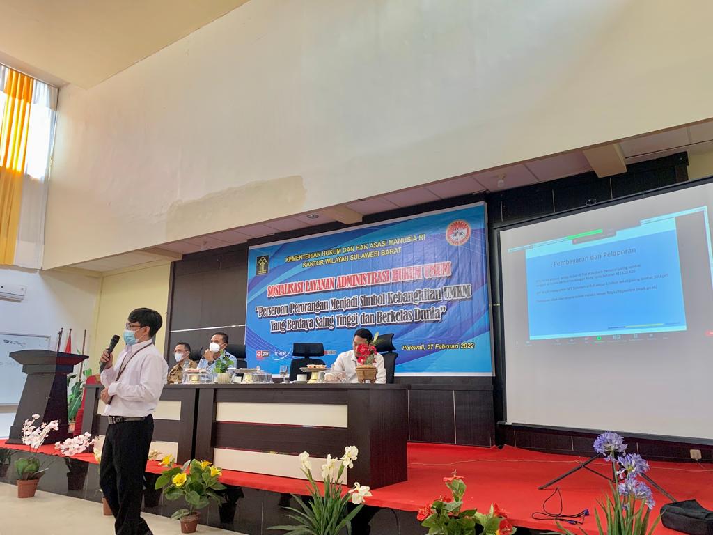 Kantor Pelayanan Pajak (KPP) Pratama Majene menghadiri undangan untuk menjadi narasumber pada acara sosialisasi layanan administrasi hukum umum yang diselenggarakan oleh Kantor Wilayah Kementerian Hukum dan Hak Asasi Manusia (Kemenkumham) Sulawesi Barat (Senin, 7/2). Sosialisasi ini berlangsung secara luring di ruang aula Hotel Sinar Mas, Kabupaten Polewali Mandar.