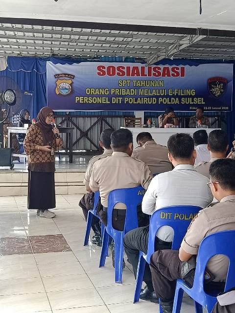 Kantor Pelayanan Pajak (KPP) Pratama Makassar Barat mengadakan kegiatan Sosialisasi Perpajakan Pelaporan SPT Tahunan menggunakan e-Filing di Kantor Dit. Kepolisian Air dan Udara (Polairud) Polda Sulsel, Kota Makassar (Selasa, 21/1). Kepala Seksi Ekstensifikasi KPP Pratama Makassar Barat bertindak langsung sebagai pemateri pada acara yang diikuti oleh seluruh personel Dit. Polairud Polda Sulsel ini.