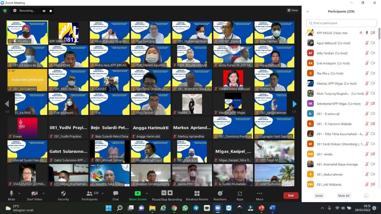 Kantor Pelayanan Pajak Minyak dan Gas Bumi (KPP Migas) mengadakan Kelas Pajak Online dengan tema Edukasi Undang-undang Harmonisasi Peraturan Perpajakan pada WP K3S (Kontraktor Kontrak Kerja Sama) melalui Zoom Cloud Meeting di Ruang Aula Mahakam KPP Migas, Jakarta (Selasa, 29/3).