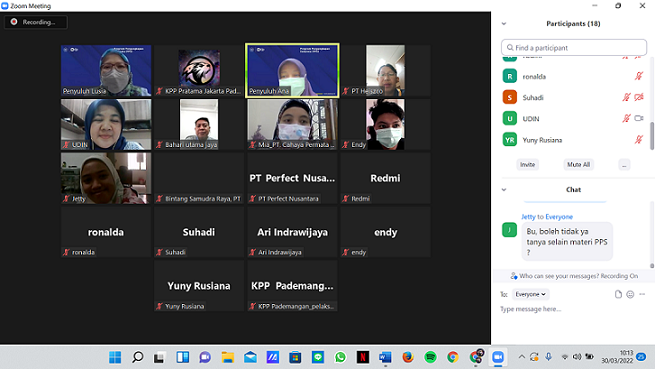 Kantor Pelayanan Pajak (KPP) Pratama Jakarta Pademangan mengadakan Kelas Pajak Program Pengungkapan Sukarela (PPS) di Jakarta (Rabu, 30/3). Kegiatan diselenggarakan melalui Zoom Meeting di ruang penyuluh KPP Pratama Jakarta Pademangan. Kelas pajak dihadiri 15 Wajib Pajak Orang Pribadi di wilayah KPP Pratama Jakarta Pademangan.