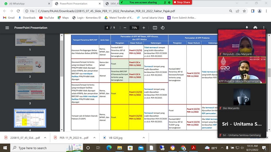 Kantor Pelayanan Pajak (KPP) Pratama Jakarta Pademangan mengadakan kelas pajak dengan tema PER-11/PJ/2022 tentang perubahan atas PER-03/PJ/2022 tentang Faktur Pajak (Rabu, 31/8).