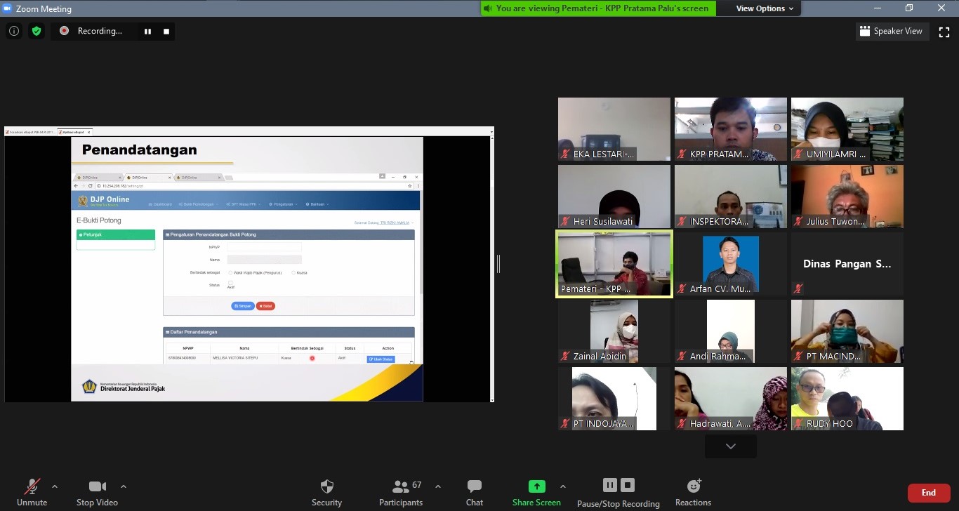 Kantor Pelayanan Pajak (KPP) Pratama Palu menyelenggarakan sesi terakhir kelas pajak e-Bupot 23/26 secara webinar melalui Zoom Meeting / Video Conference kepada wajib pajak Pengusaha Kena Pajak (PKP) yang terdaftar di Kantor Pelayanan Pajak Pratama Palu (Selasa, 28/7). Sebanyak 387 wajib pajak antuasias mengikuti sosialisasi e-Bupot 23/26 yang bertempat tinggal di Kota Palu, Kab. Sigi, Kab. Donggala dan Kab. Parigi Moutong.