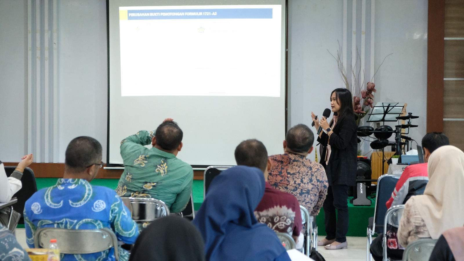 Acara dilanjutkan dengan penyampaian materi dari Penyuluh Pajak Agata Cahyaning Widhiartanti terkait Peraturan Menteri Keuangan Nomor 168 Tahun 2024 (PMK-168/2024) Tentang Petunjuk Pelaksanaan Pemotongan Pajak Atas Penghasilan Sehubungan Dengan Pekerjaan, Jasa, Atau Kegiatan Orang Pribadi dan PER-05/PJ/2024 tentang Perubahan Atas Peraturan Direktur Jenderal Pajak Nomor PER-17/PJ/2021 Tentang Bentuk dan Tata Cara Pembuatan Bukti Pemotongan dan/atau Pemungutan Pajak, Serta Bentuk, Isi, Tata Cara Pengisian, dan Penyampaian Surat Pemberitahuan Masa Bagi Instansi Pemerintah.