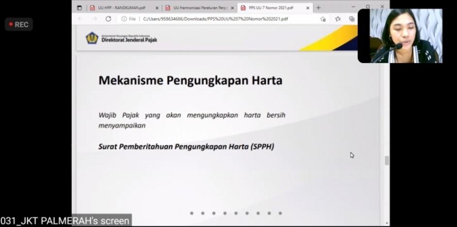 Materi terakhir tentang Program Pengungkapan Sukarela disampaikan oleh Devi Winda Kristina Ambarita. Dalam paparannya Devi menjelaskan tentang subjek, objek, cara menghitung, tarif, Dasar Pengenaan Pajak, Persyaratan, Mekanisme Pengungkapan Harta, periode pelaksanaan dan Fasilitas yang diperoleh Wajib Pajak yang mengikuti program ini. “Untuk bentuk formulir dan teknis pengungkapan harta, kita tunggu peraturan pelaksanaan dari undang-undang HPP ini”, pungkas Devi dalam akhir paparan materi.