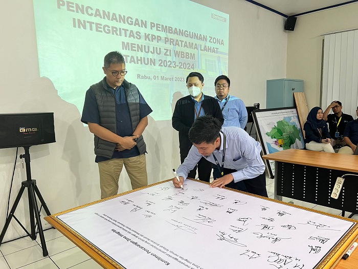 Kantor Pelayanan Pajak (KPP) Pratama Lahat mencanangkan Zona Integritas menuju Wilayah Birokrasi Bersih dan Melayani (ZI WBBM) tahun 2023-2024 di Ruang Rapat KPP Pratama Lahat, Kabupaten Lahat, Sumatera Selatan (Rabu, 1/3).