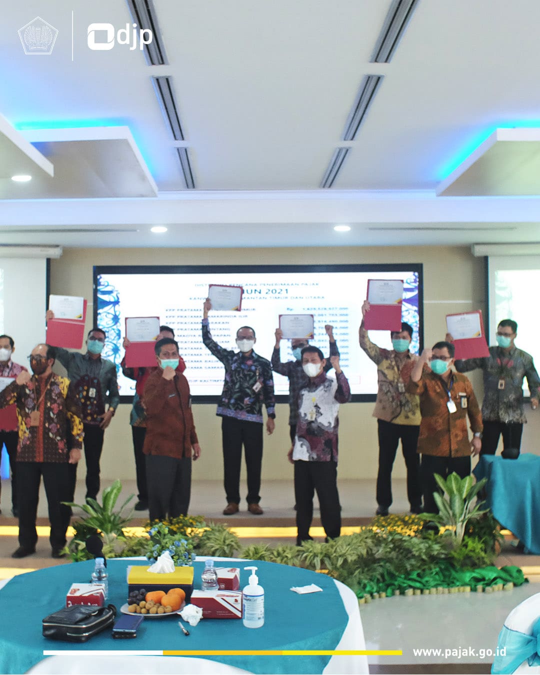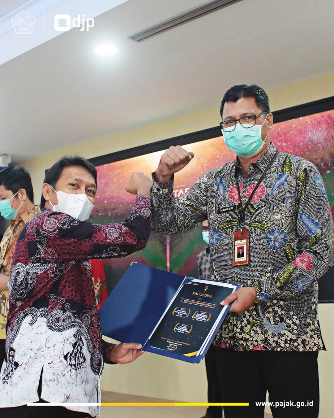 Hutomo Budi Kepala KPP Pratama Samarinda Ulu menerima langsung piagam penghargaan yang diberikan Plh. Kepala Kanwil DJP Kaltimtara Samon Jaya di Aula Kanwil DJP Kaltimtara dalam Rapat Pimpinan Daerah (Rapimda) Tahun 2021 Kanwil DJP Kaltimtara dengan tajuk “Sinergi Membangun Prestasi" (Rabu, 10/2).