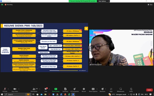 Kantor Pelayanan Pajak (KPP) Pratama Semarang Timur melaksanakan edukasi peraturan perpajakan terbaru Peraturan Pemerintah Nomor 58 Tahun 2023 secara daring di Semarang (Jumat, 2/2). Aturan ini tentang Tarif Pemotongan Pajak Penghasilan Pasal 21 atas Penghasilan Sehubungan dengan Pekerjaan, Jasa, atau Kegiatan Wajib pajak Orang Pribadi dan Peraturan Menteri Keuangan Republik Indonesia Nomor 168 Tahun 2023 tentang Petunjuk Pelaksanaan Pemotongan Pajak atas Penghasilan Sehubungan dengan Pekerjaan, Jasa, atau Kegiatan Orang Pribadi.