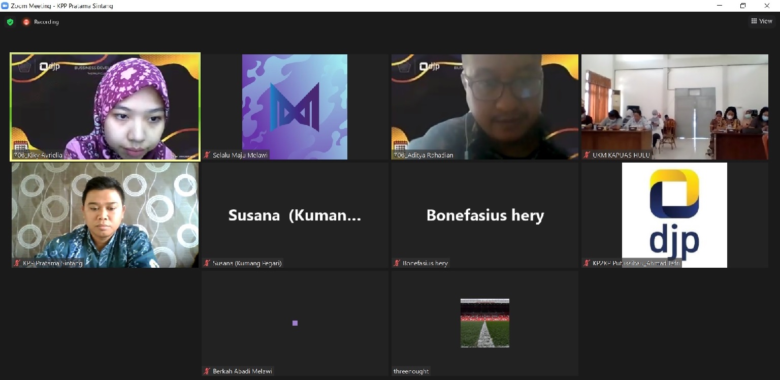 Sosialisasi secara daring ini dilaksanakan melalui media Zoom Meeting dengan pemateri dari Kantor Pelayanan Pajak (KPP) Pratama Sintang. Nampak wajib pajak sangat aktif dalam mengikuti kegiatan sosialisasi ini. Mereka tidak hanya bertanya mengenai UU HPP yang menjadi tema utama pada sosialisasi kali ini, tetapi wajib pajak juga melakukan konsultasi mengenai kewajiban perpajakannya.