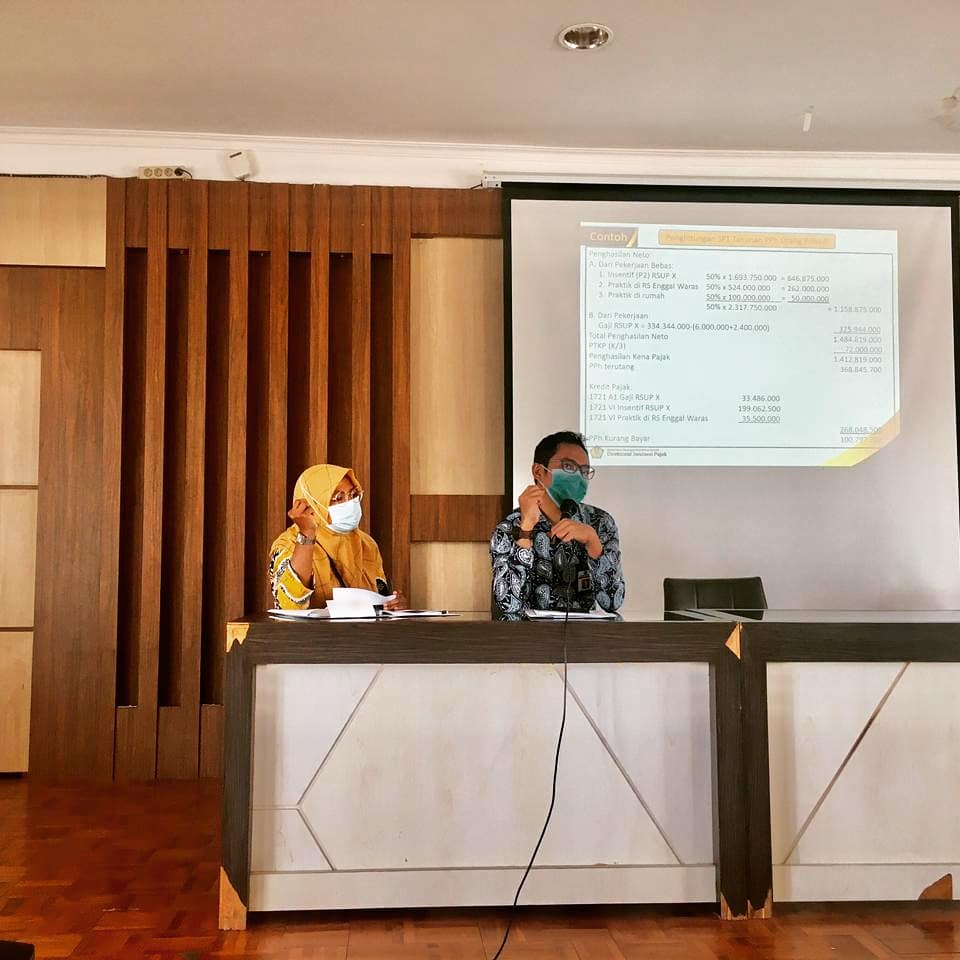 Kegiatan ini dihadiri oleh tenaga medis yang bekerja di RS Mohammad Natsir dengan tetap memperhatikal protokol kesehatan penangulangan Covid-19. Tim penyuluh KPP Pratama Solok menyampaikan materi tentang mekanisme pemotongan PPh Pasal 21 bagi dokter dan penghasilan yang dikenakan pajak.