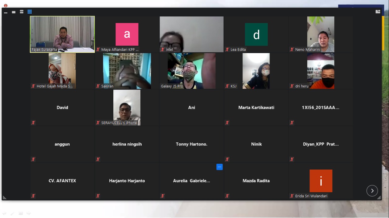 Kantor Pelayanan Pajak (KPP) Pratama Surakarta menyelenggarakan Sosialisasi Insentif Pajak untuk Wajib Pajak Terdampak Pandemi Covid-19 secara daring melalui media telekonferensi di ruang kelas pajak KPP Pratama Surakarta (Jumat, 9/10). Sosialisasi ini diadakan selama lima hari sejak Senin, 5 Oktorber 2020.