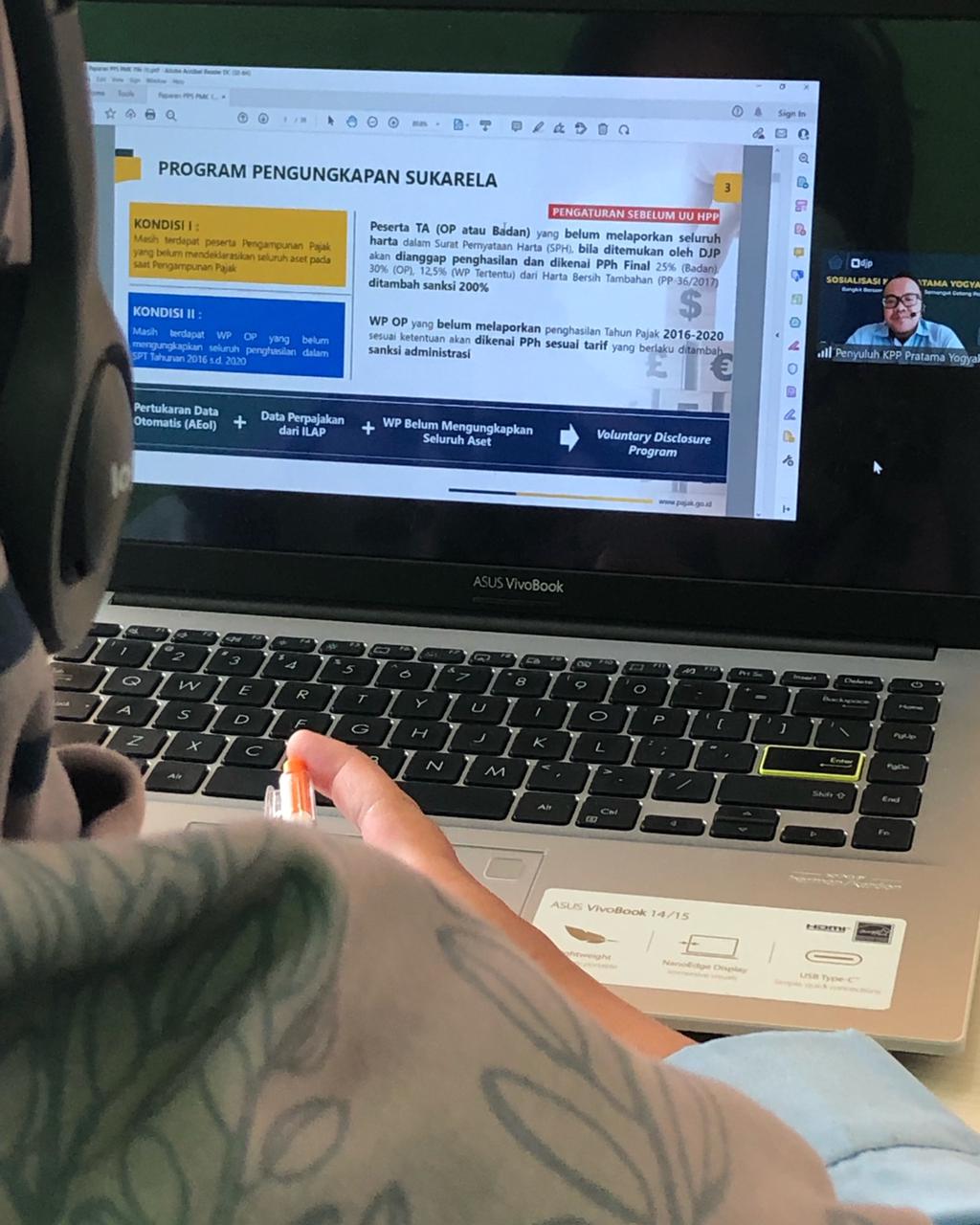 Kantor Pelayanan Pajak (KPP) Pratama Yogyakarta yang diwakili oleh tim Fungsional Penyuluh Pajak Rudi Hendriawan dan Sri Hartini melakukan sosialisasi tentang Program Pengungkapan Sukarela (PPS) secara daring dari studio penyuluh lantai 2 KPP Pratama Yogyakarta (Kamis, 31/3).