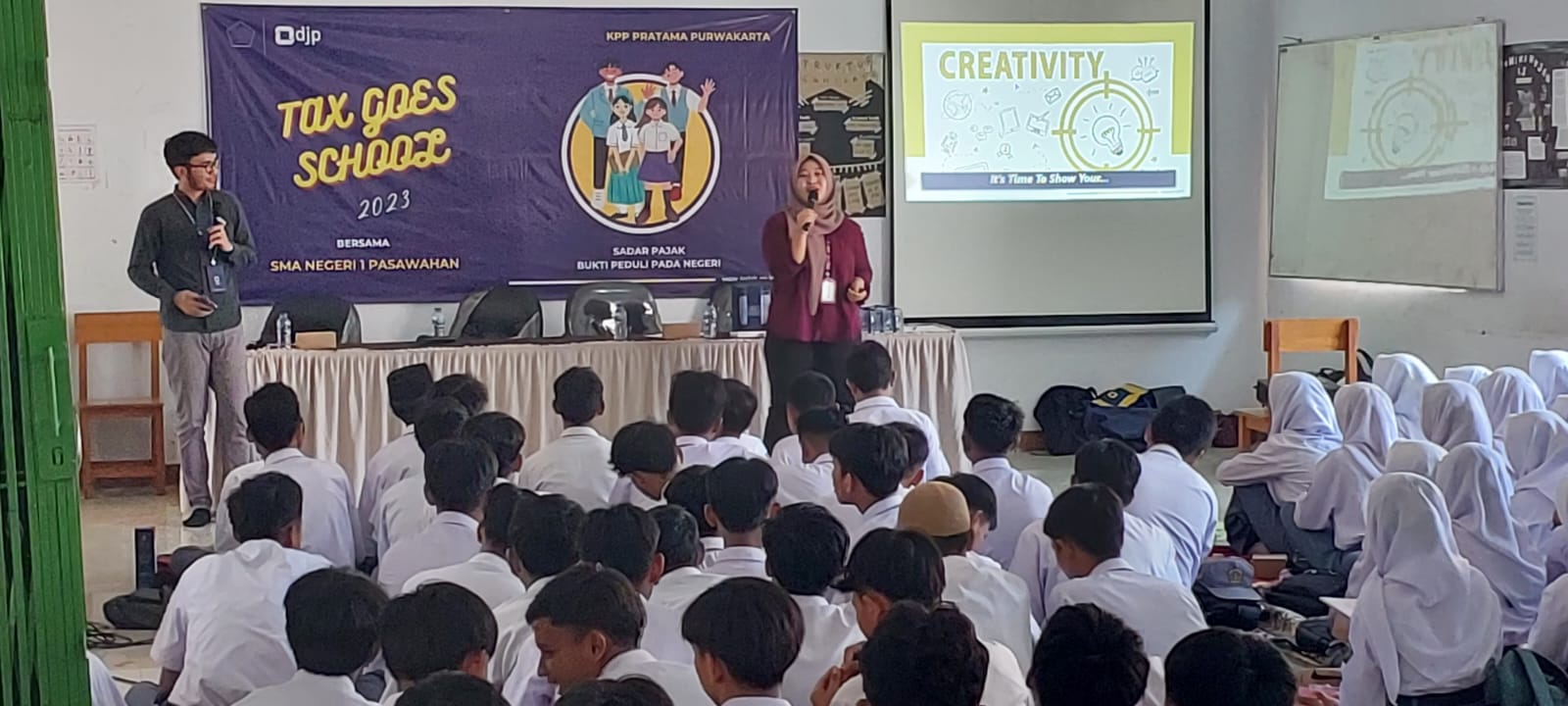Kantor Pelayanan Pajak (KPP) Purwakarta menggelar kegiatan Tax Goes to School (TGTS) yang diadakan di Aula Sekolah Menengah Atas (SMA) Negeri 1 Pasawahan, Jl. Kapten Halim No.1, Pasawahan, Kec. Pasawahan, Kabupaten Purwakarta (Selasa, 5/9).