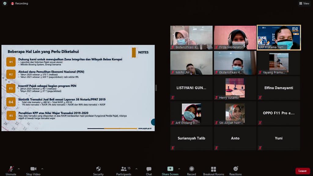 Kantor Pelayanan Pajak (KPP) Pratama Samarinda Ilir menyelenggarakan kegiatan kelas pajak secara daring melalui Zoom Meetings di Samarinda (Kamis, 4/3). Acara ini dimulai pukul 10:00 WITA dan diikuti oleh 11 Notaris yang berdomisili di Samarinda.