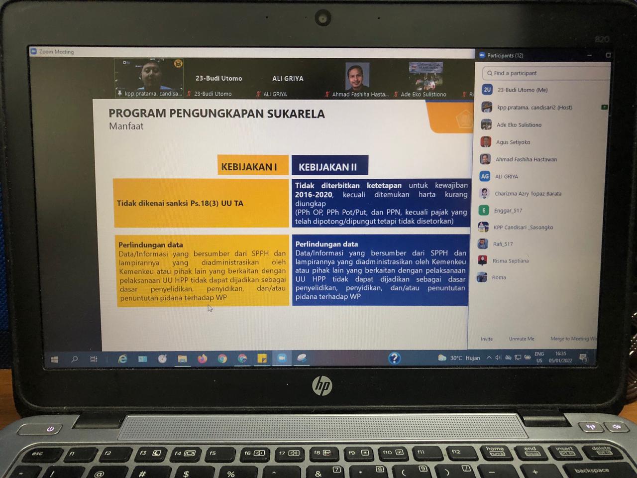 Kantor Pelayanan Pajak (KPP) Pratama Semarang Candisari menggelar Kelas Pajak Online Program Pengungkapan Sukarela (PPS) secara daring melalui Zoom meeting untuk meningkatkan pemahaman program pengungkapan sukarela yang disampaikan langsung oleh Tim Penyuluh KPP Pratama Candisari pukul 09.00 hingga selesai di Semarang (Rabu, 12/1).