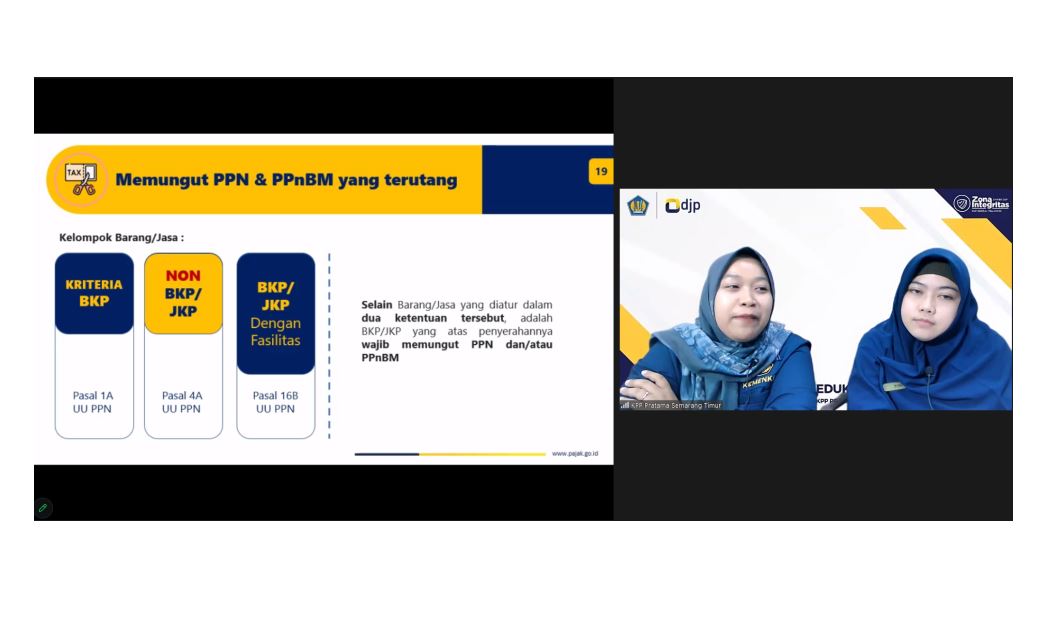 Penyuluh KPP Pratama Semarang Timur, Rimananda Andriani menyampaikan hal-hal yang menjadi hak dan kewajiban perpajakan untuk Wajib Pajak Badan PKP. Sebagai Wajib Pajak Badan PKP terdapat hak dan kewajiban perpajakan dalam kegiatan usahanya, antara lain melakukan pemungutan PPN atas penjualan barang atau penyerahan jasa yang biasa dikenal sebagai PPN Keluaran, lalu untuk transaksi pembelian barang dari supplier Wajib Pajak akan mengreditkan PPN nya yang disebut sebagai PPN Masukan.