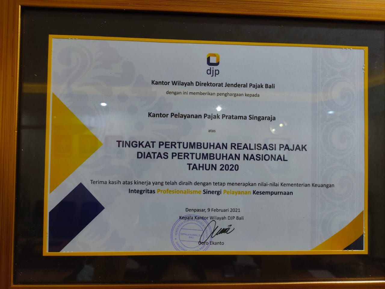 Kantor Pelayanan Pajak (KPP) Pratama Singaraja berhasil memperoleh dua penghargaan dari Kanwil DJP Bali atas kinerjanya dalam pencapaian penerimaan pajak diatas pencapaian nasional tahun 2020 dan tingkat pertumbuhan realisasi pajak di atas pertumbuhan nasional tahun 2020. Penghargaan tersebut diberikan seusai acara Rapat Koordinasi Daerah I Kantor Wilayah DJP Bali yang bertempat di ruang aula Kanwil DJP Bali (Selasa, 9/2).