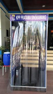 Dalam rangka pencegahan penyebaran Covid-19. KPP Pratama Singkawang menyediakan bilik sterilisasi di area depan pintu masuk kantor dan melaksanakan penyemprotan disinfektan di lingkungan kantor setiap hari (Senin, 11/5). Selain itu, nampak pada beberapa sudut di KPP Pratama Singkawang dipasang bracket handsanitizer.