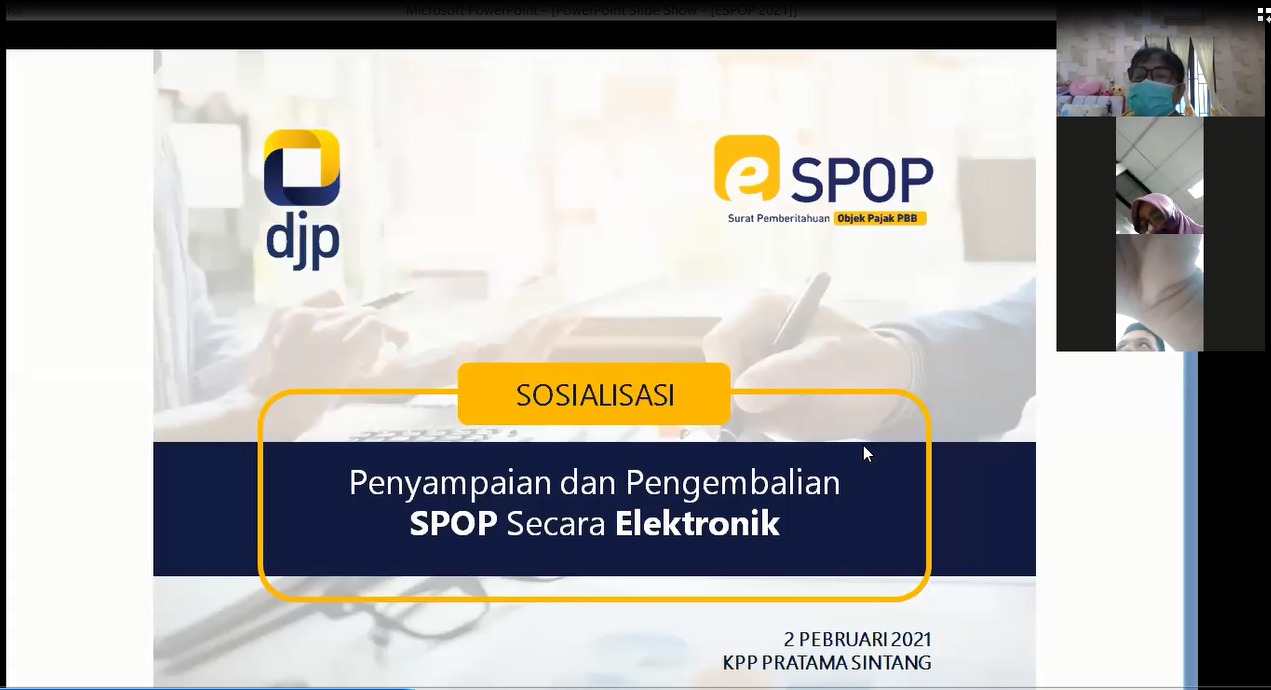 Kantor Pelayanan Pajak (KPP) Pratama Sintang mengadakan Sosialisasi Penyampaian dan Pengembalian Surat Pemberitahuan Objek Pajak Bumi dan Bangunan Secara Elektronik Tahun 2021 secara daring melalui aplikasi Zoom Meeting untuk Wilayah Sintang, Melawi dan Kapuas Hulu, Kabupaten Sintang (Selasa, 2/2). Sosialisasi ini diadakan dengan tujuan memberikan edukasi tentang penggunaan e-SPOP 2021.