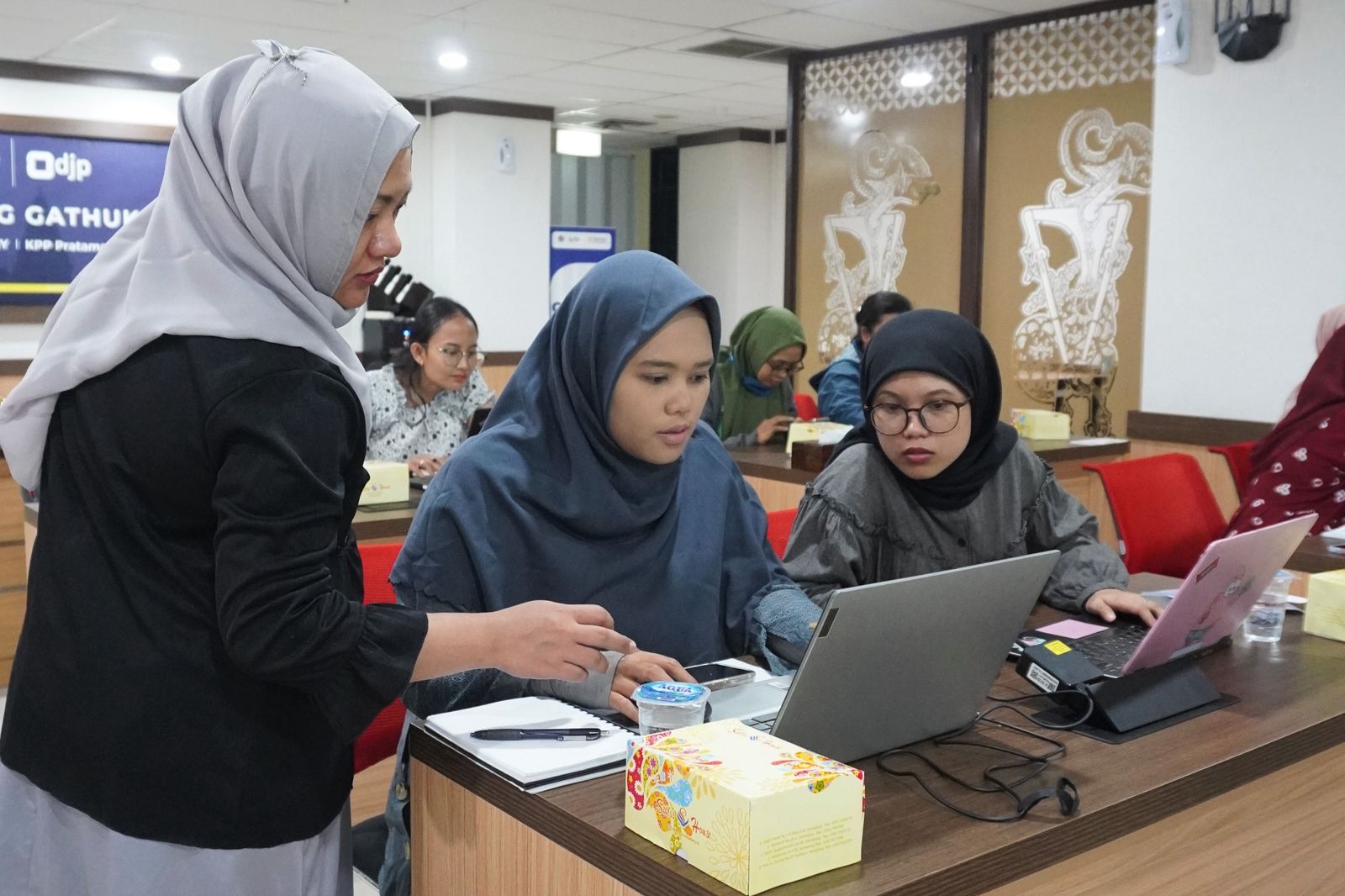 Wajib pajak dipandu oleh tim edukasi KPP Sleman dalam mengoperasikan aplikasi Coretax. Mereka membuka menu-menu dalam aplikasi ini.
