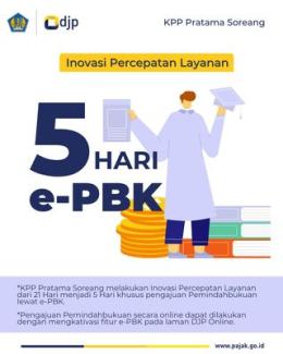 Kantor Pelayanan Pajak (KPP) Pratama Soreang melakukan inovasi percepatan layanan permohonan pemindahbukuan (PBK) dari 21 hari menjadi 5 hari untuk pengajuan pemindahbukuan melalui e-PBK di kanal pajak.go.id.