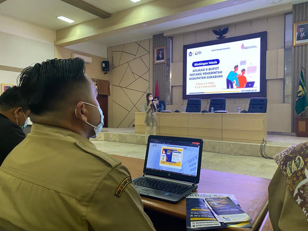 Kantor Pelayanan Pajak (KPP) Pratama Sukabumi mengadakan bimbingan teknis (bimtek) Aplikasi e-Bupot Instansi Pemerintah di Aula Setda Pelabuhanratu, Jalan Siliwangi Kabupaten Sukabumi (Selasa, 8/3). Kegiatan ini diselenggarakan selama dua hari sampai dengan Rabu, 9 Maret 2022.