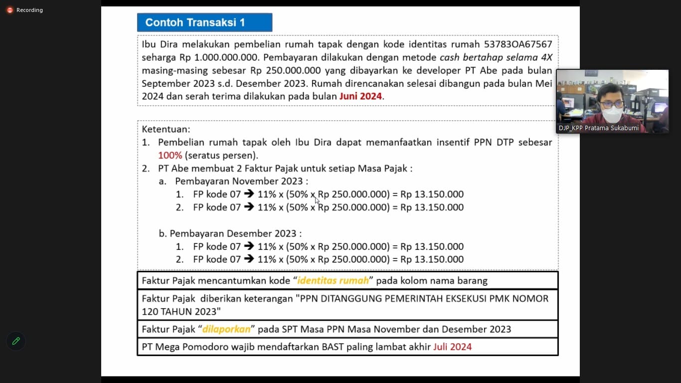 Tim Penyuluh Kantor Pelayanan Pajak (KPP) Pratama Sukabumi gelar Kelas Pajak Online terkait Peraturan Menteri Keuangan (PMK) Nomor 120 Tahun 2023 tentang Pajak Pertambahan Nilai (PPN) atas Penyerahan Rumah Tapak dan Satuan Rumah Susun yang Ditanggung Pemerintah Tahun Anggaran melalui Live Instagram @pajaksukabumi (Kamis, 17/12).