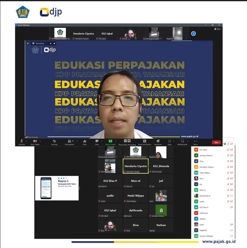 KPP Pratama Jakarta Tamansari mengadakan sosialisasi Pelaporan SPT Tahunan kepada Wajib Pajak Orang Pribadi secara daring melalui zoom meeting KPP Pratama Jakarta Tamansari di Jakarta (Kamis, 3/8). Sosialisasi dilaksanakan untuk memberikan edukasi kepada wajib pajak dalam menjalankan kewajiban pelaporan SPT Tahunan.