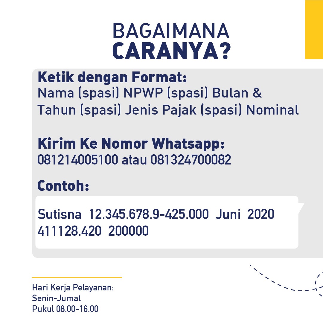 Cara untuk memperoleh kode billing melalui WhatsApp yaitu wajib pajak hanya cukup mengirimkan pesan singkat ke nomor 081214005100 atau 081324700082 dengan format: Nama (spasi) NPWP (spasi) Bulan dan Tahun (spasi) Jenis pajak (spasi) Nominal. Contoh penulisan formatnya yaitu Sutisna 12.345.678.9-425.000 Juni 2020 411128.420 200000.