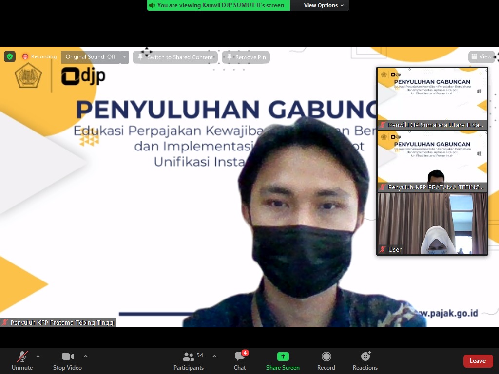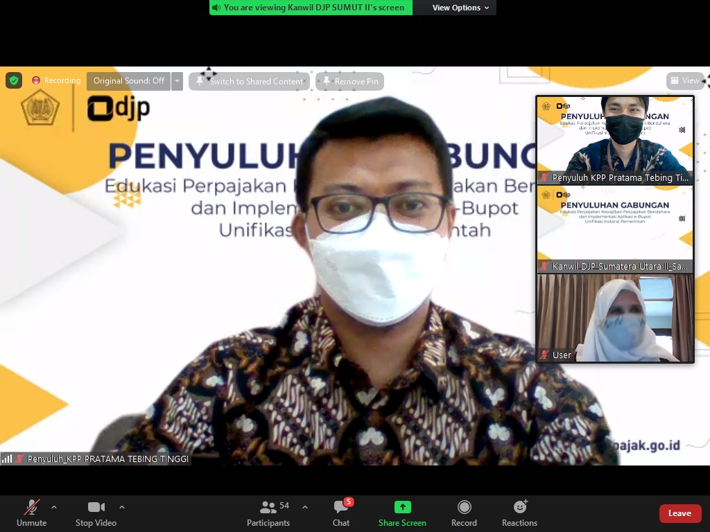 Kantor Pelayanan Pajak (KPP) Pratama Tebing Tinggi bersama Kantor Wilayah (Kanwil) Direktorat Jenderal Pajak (DJP) Sumatera Utara II mengadakan edukasi perpajakan bagi Bendahara Instansi Pemerintah se-Kota Tebing Tinggi. Kegiatan tersebut dilaksanakan secara webinar menggunakan media Zoom Meeting di ruang aula Lantai II KPP Pratama Tebing Tinggi, Tebing Tinggi (Jumat, 3/9). Peserta yang hadir merupakan perwakilan bendahara dari seluruh Instansi Vertikal dan Satuan Kerja Perangkat Daerah yang tersebar di wilayah Kota Tebing Tinggi.