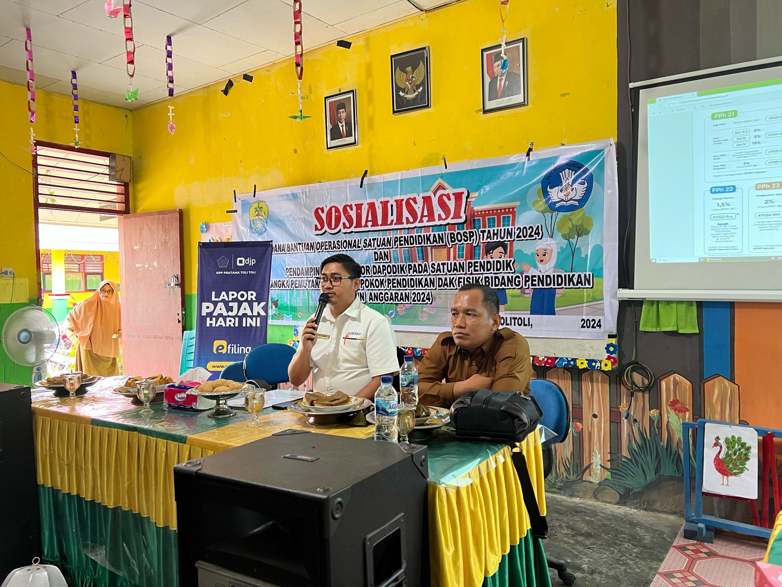 Kantor Pelayanan Pajak (KPP) Pratama Tolitoli menyelenggarakan kegiatan edukasi tentang pengelolaan Bantuan Operasional Satuan Pendidikan (BOSP). Kegiatan ini merupakan hasil kerja sama dengan Dinas Pendidikan dan Kebudayaan Tolitoli, Sulawesi Tengah (Senin, 5/2). Kegiatan ini berlangsung mulai tanggal 1 s.d. 9 Februari 2024. Berlangsung mulai pukul 08.00 s.d. 17.00 WITA, kegiatan ini tidak berlangsung di satu tempat saja, melainkan berpindah tempat setiap harinya.