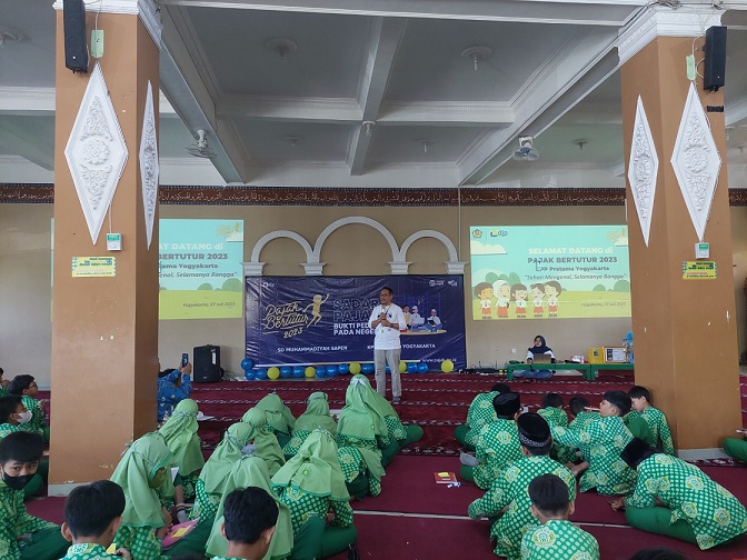 Kantor Pelayanan Pajak (KPP) Pratama Yogyakarta menyelenggarakan kegiatan Pajak Bertutur (Patur) 2023 dengan tema “Sadar Pajak, Bukti Peduli pada Negeri” di SD Muhammadiyah Sapen, Kota Yogyakarta (Kamis, 27/7). Hadir dalam kegiatan ini sebanyak 218 siswa-siswi kelas V SD Muhammadiyah Sapen.