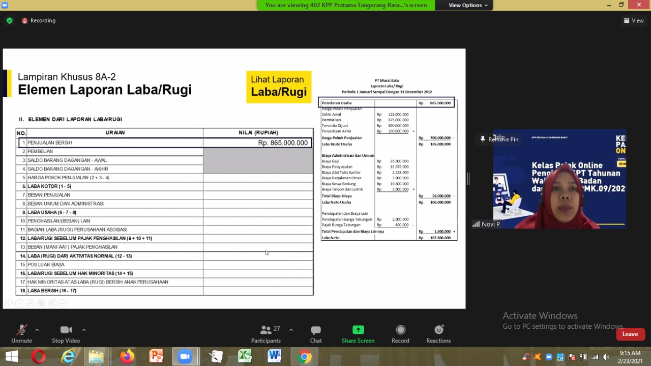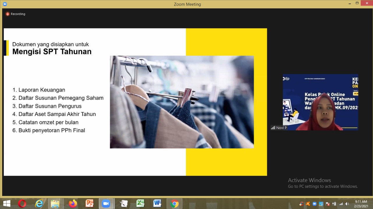 Kantor Pelayanan Pajak (KPP) Pratama Tangerang Barat mengadakan kelas pajak virtual dengan tema pengisian SPT Tahunan bersama sejumlah perwakilan wajib pajak badan melalui aplikasi Zoom Cloud Meeting di Kota Tangerang (Selasa, 23/2).
