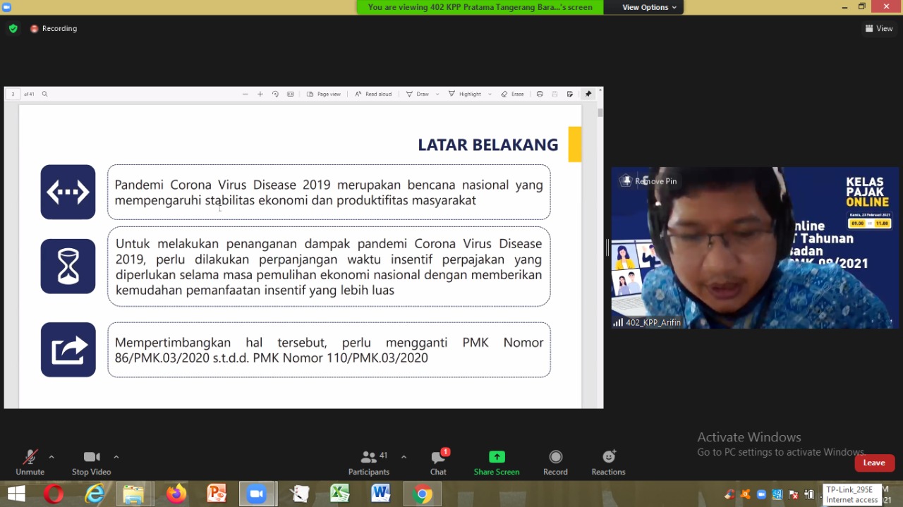 Mengingat pandemi yang belum berakhir, dalam kesempatan asistensi pengisian SPT ini, diberikan pula tambahan materi mengenai PMK-9/PMK.03/2021 tentang insentif pajak bagi wajib pajak terdampak Covid-19 yang masih dapat dimanfaatkan oleh wajib pajak hingga Juni 2021. Acara kemudian dilanjutkan dengan sesi tanya jawab.
